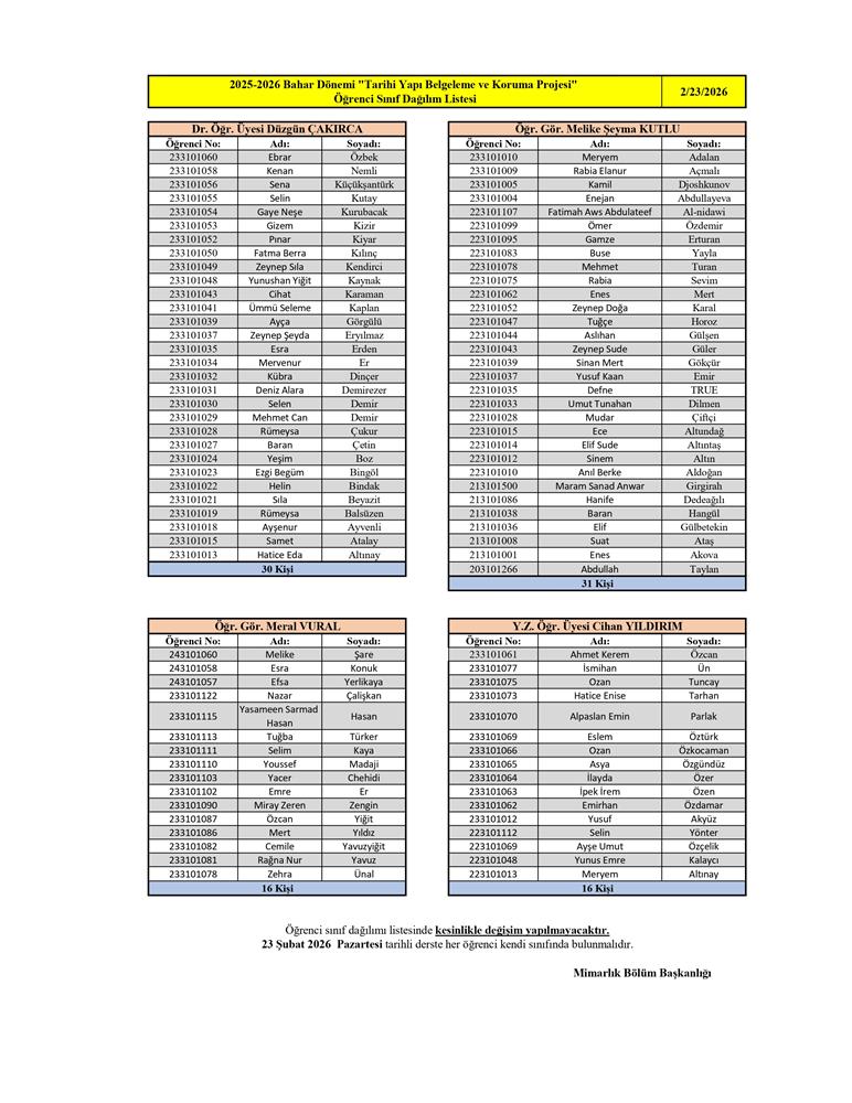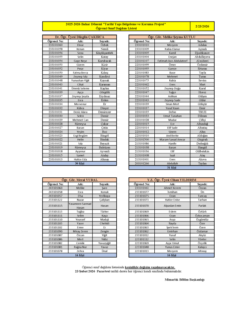 2025-2026 Eğitim - Öğretim Yılı Bahar Dönemi "Tarihi Yapı Belgeleme ve Koruma Projesi" Öğrenci Sınıf Dağılım Listesi